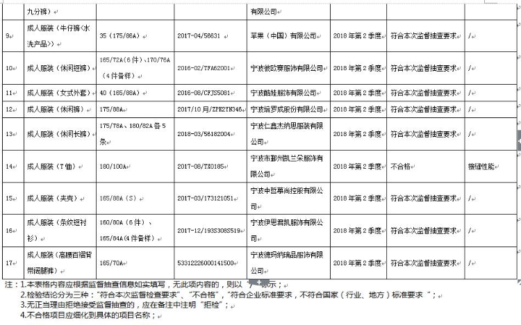 据宁波市质量技术监督局官网7月18日消息,近期,根据《中华人民共和国产品质量法》、《浙江省产品质量监督条例》的规定,宁波市质量技术监督局组织开展了全市成人服装产品定期监督抽查,抽查了17家企业的17批次产品,经检验,发现不合格3批次,产品不合格项目为使用说明(标识)、接缝性能等项目。