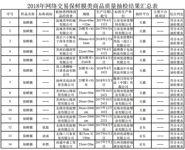 近日,江苏省工商行政管理局公布2018年网络交易保鲜膜类商品质量抽检情况。此次抽检的保鲜膜类商品共47批次,涉及天猫、京东、苏宁易购、阿里巴巴4家网络交易平台。经检验,47批次所检项目合格,符合此次抽检要求,0批次不合格,不合格商品检出率为0%。