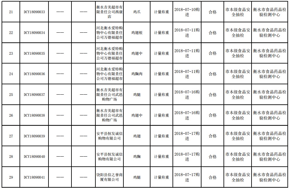 近日,衡水市食品和市场监督管理局发布市本级食品安全监督抽检信息公告(2018第21批)。本次发布的监督抽检信息涉及餐饮食品1大类,共抽检样品29批次,其中合格29批次。