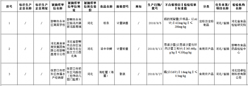 河北省市场监督管理局抽检156批次食品 3批次不合格