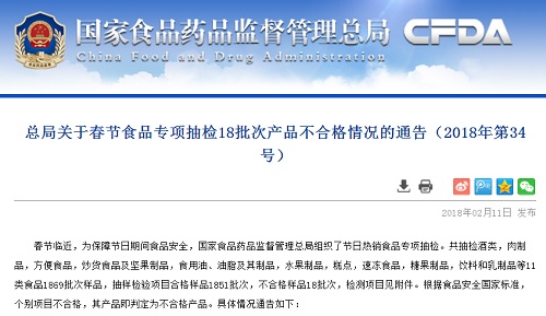 2018年2月11日,国家食品药品监督管理总局官网发布《总局关于春节食品专项抽检18批次产品不合格情况的通告(2018年第34号)》。据通告,春节临近,国家食品药品监督管理总局组织了节日热销食品专项抽检,共抽检11类食品1869批次样品,抽样检验项目合格样品1851批次,不合格样品18批次。