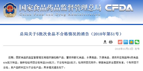 2018年3月13日,国家食品药品监督管理总局官网发布《总局关于5批次食品不合格情况的通告(2018年第51号)》。据通告,近期,国家食品药品监督管理总局组织抽检6类食品404批次样品,抽样检验项目合格样品399批次,不合格样品5批次。