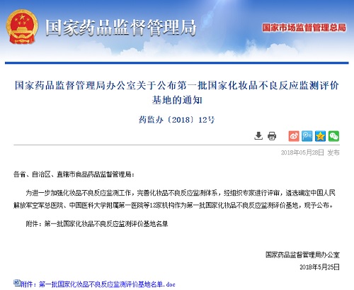 2018年5月28日,国家药品监督管理局官网发布通知药监办〔2018〕12号,为进一步加强化妆品不良反应监测工作,完善化妆品不良反应监测体系,经组织专家进行评审,遴选确定中国人民解放军空军总医院、中国医科大学附属第一医院等12家机构作为第一批国家化妆品不良反应监测评价基地