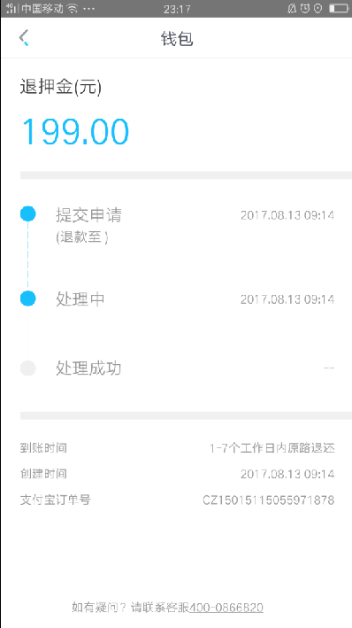 小鸣单车订单号CZ1505435432984880 支付宝付款订单号 2017081321001004420278632750 小鸣单车超时未退还押金 ...
