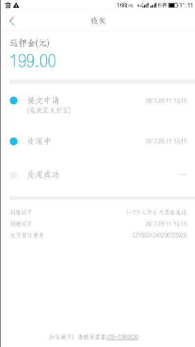 支付宝订单号2017081121001004340280653054 小鸣单车不退押金199元...