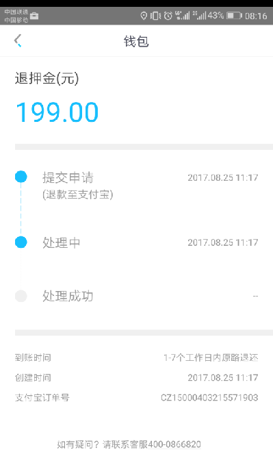本人8月23日退的押金到今天迟迟没有到账,7日内退款承诺成一纸空文!小鸣单车的客服热线始终处于占线状态,人工客服已经没有了,请尽快处理好退钱,谢谢! ...