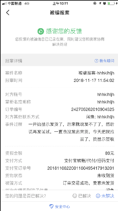 - 在闲鱼平台买东西没有得到处理也没退还我