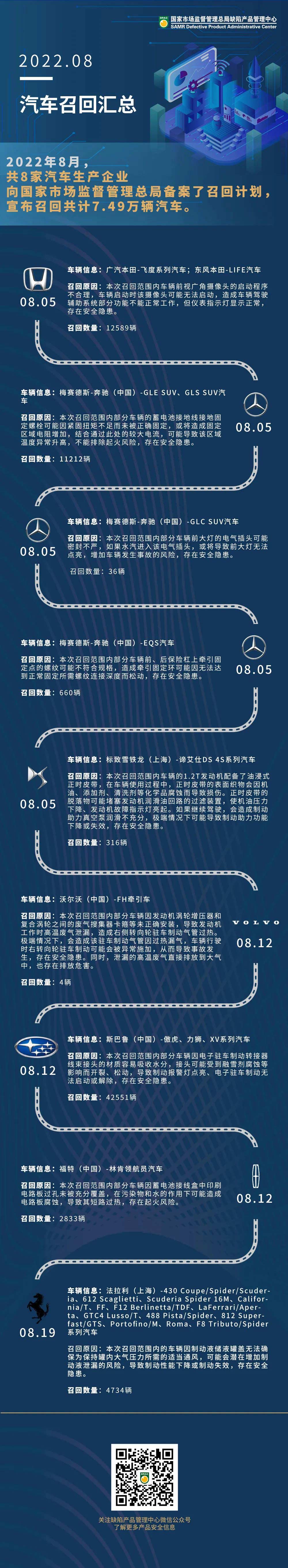 2022年8月,共8家汽车生产企业向国家市场监督管理总局备案了召回计划,宣布召回共计7.49万辆汽车。